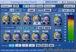 VST плагин LF Max Punch динамично подчеркивает отобранный диапазон низких частот, применяет к нему плавное насыщение и производит дополнительное под гармоничное содержание со способностью смешивания его с оригинальными звуками басовой группы. Дает возможность применить дополнительное сжатие. LF Max Punch вперед разделяет широкополосный сигнал на низкие – и высокие частотные группы, а затем применяет вышеупомянутые эффекты только к более низкой группе.
